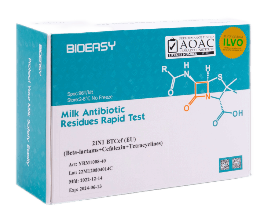 This rapid test is used for detection of Beta-lactams, Cefalexin and Tetracyclines in milk based on the colloidal gold immunochromatography technology. It takes about 9 min for one test.